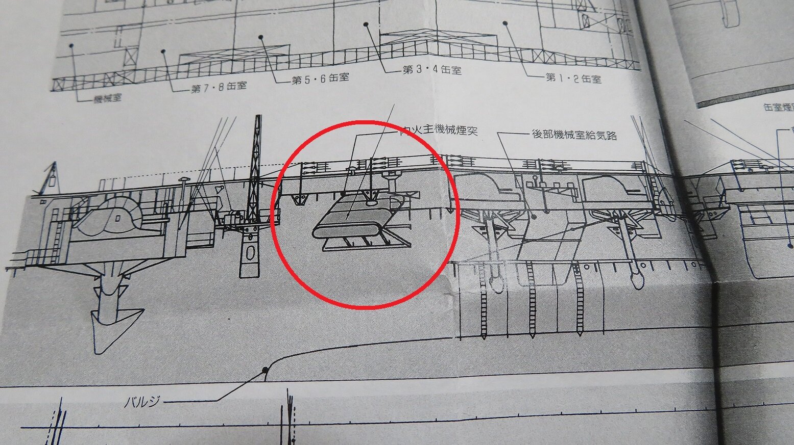 前方にある大きな煙突が缶室からのものです。一方後ろ側の煙突はディーゼル用の煙突となります。