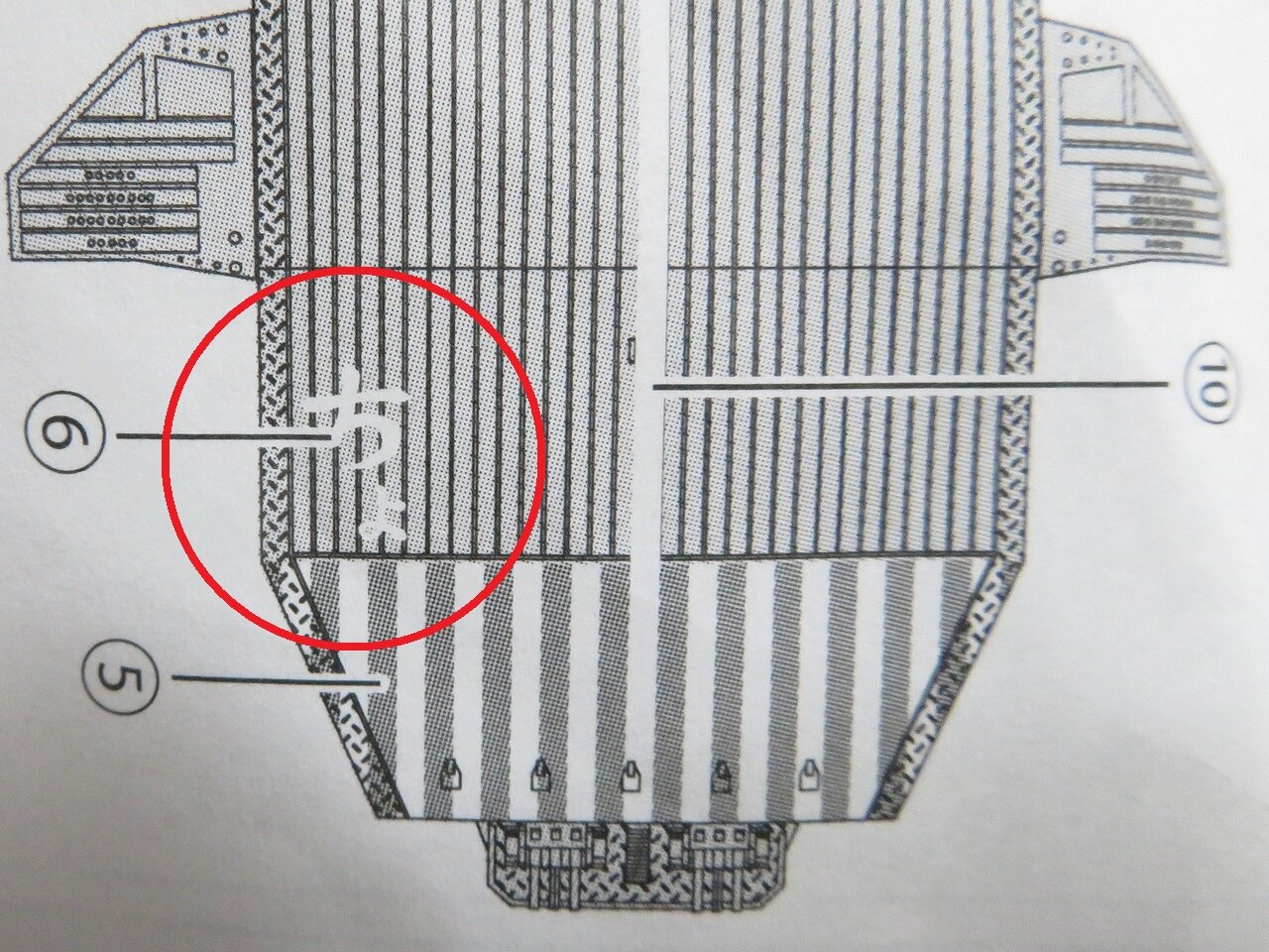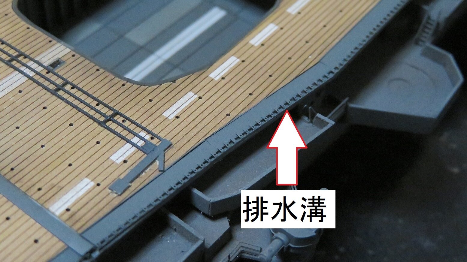 塗装指示通りに仕上げたものですが、実際は木甲板は一枚通しではなくいくつかのブロックに分割されています。