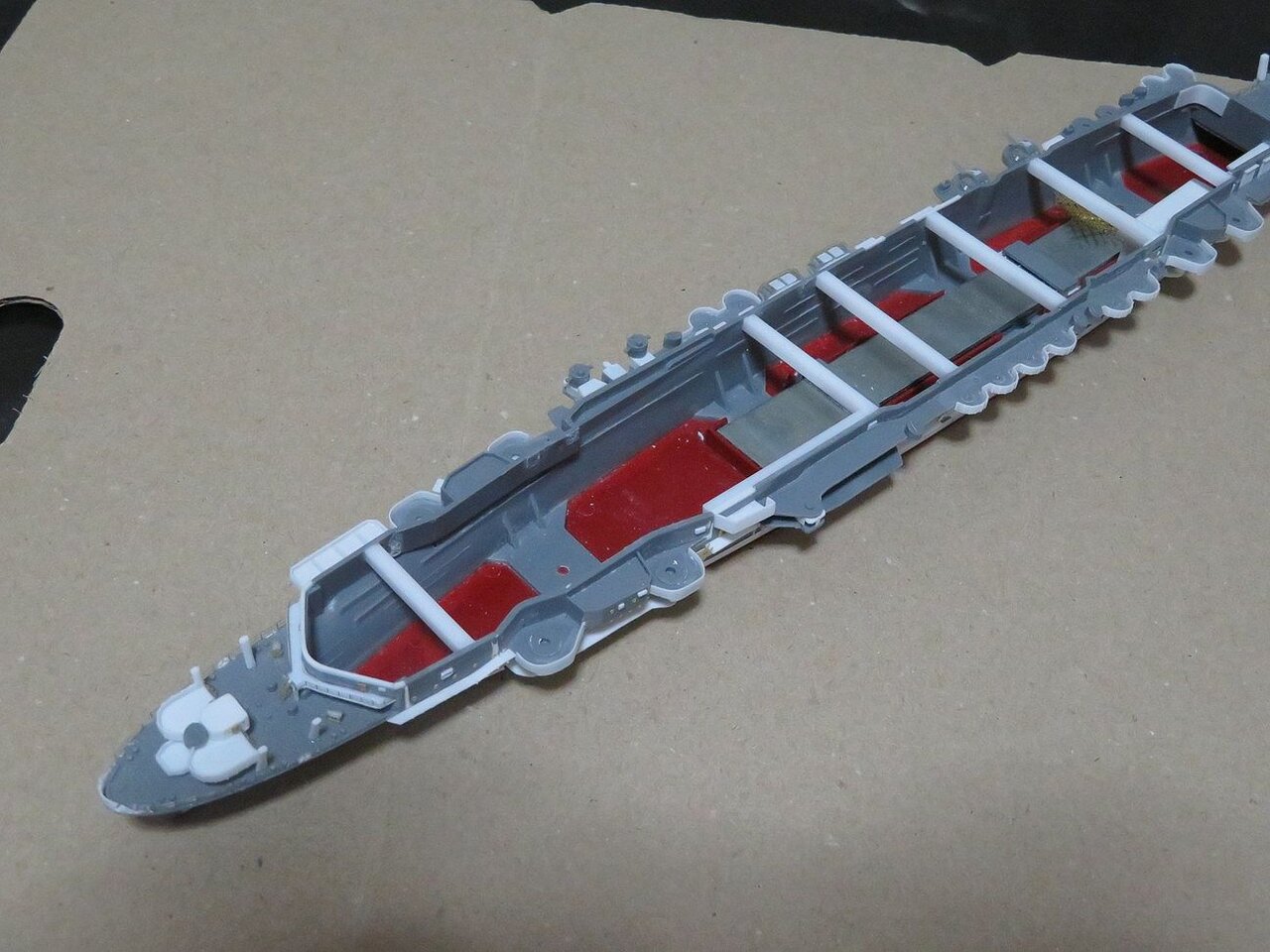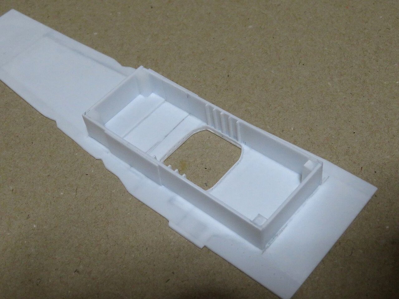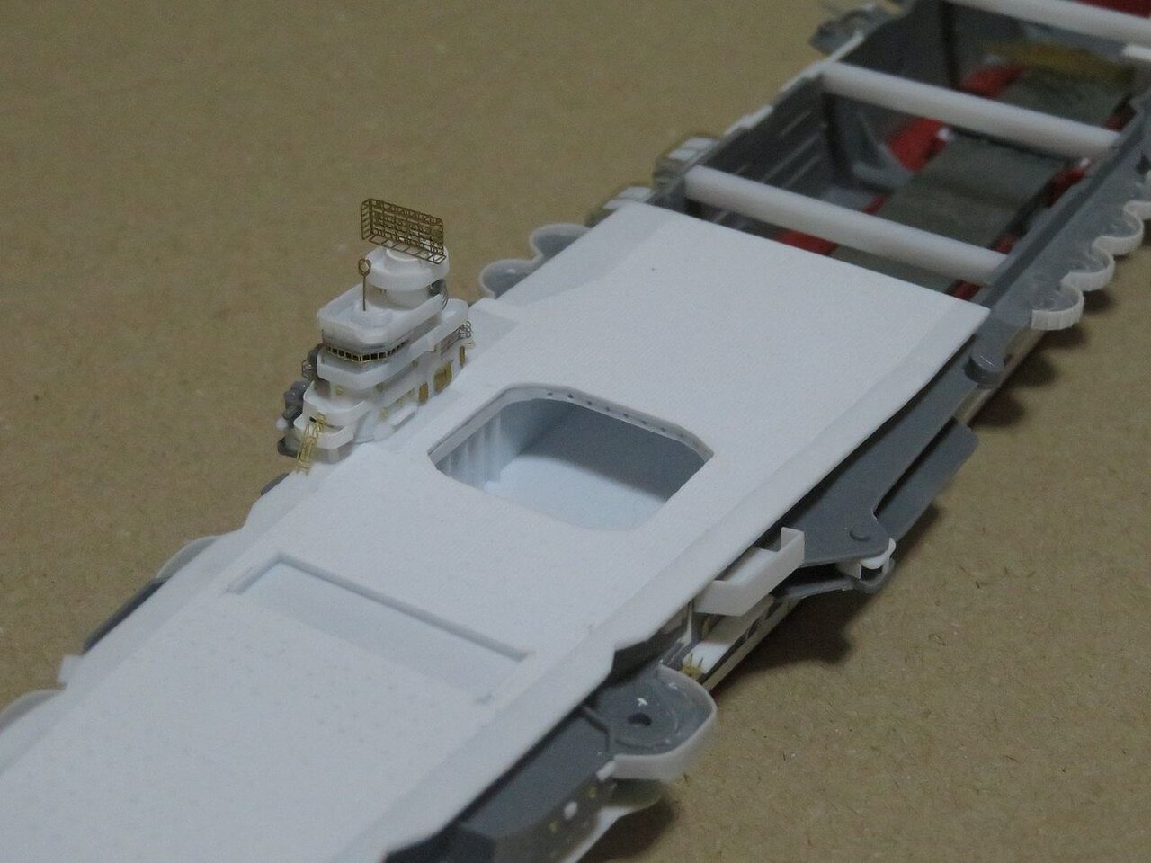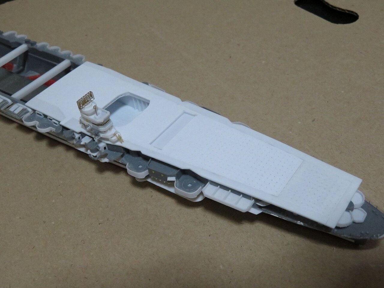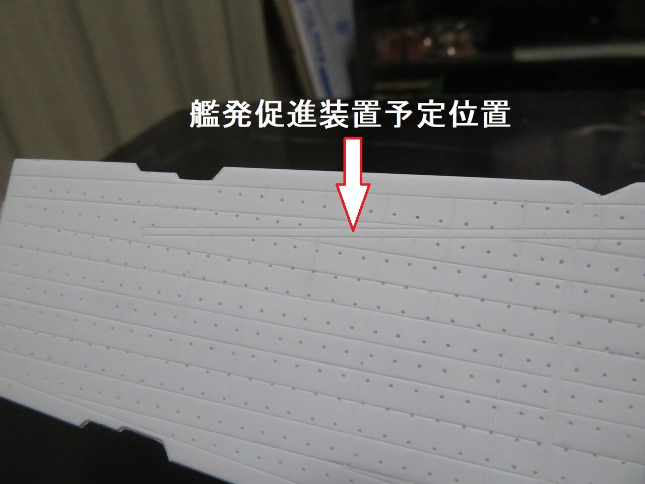遮風柵とは飛行甲板上の艦載機を風から守るために立てられる鋼板で、秒速50mの風に耐えるように作られているようです。今日製作したのはその遮風柵を飛行甲板内に収めるレセスの部分です。
