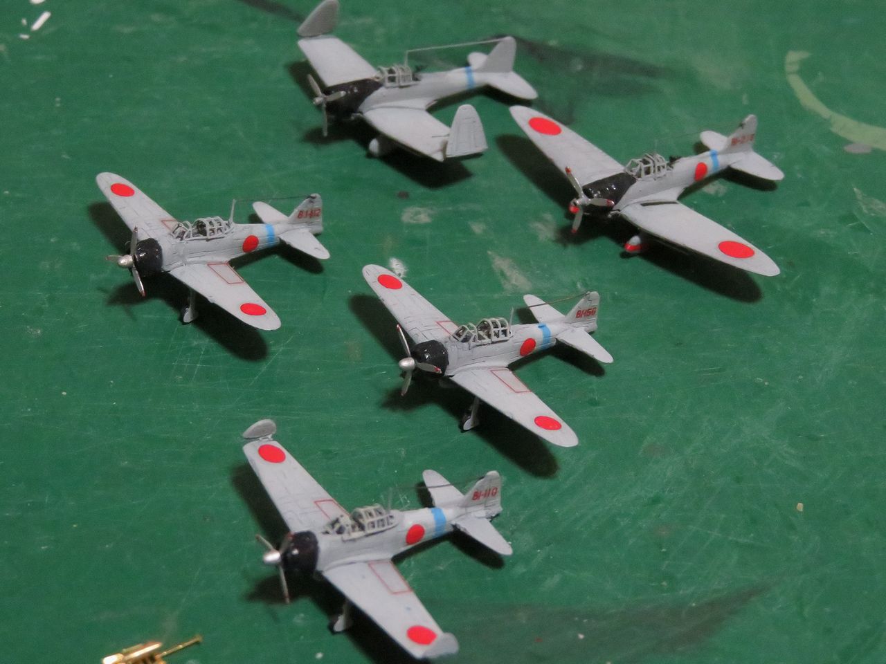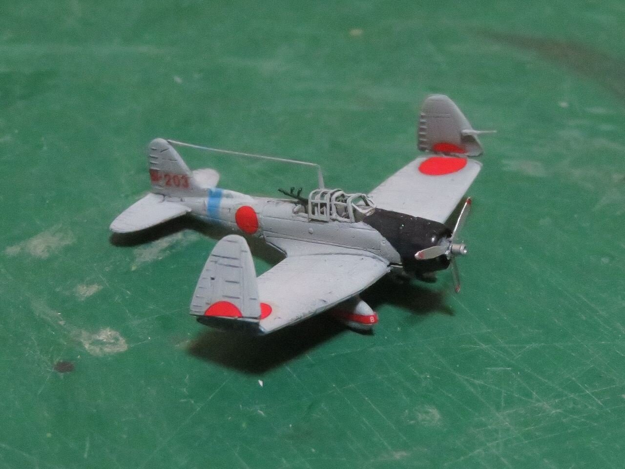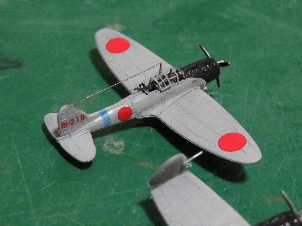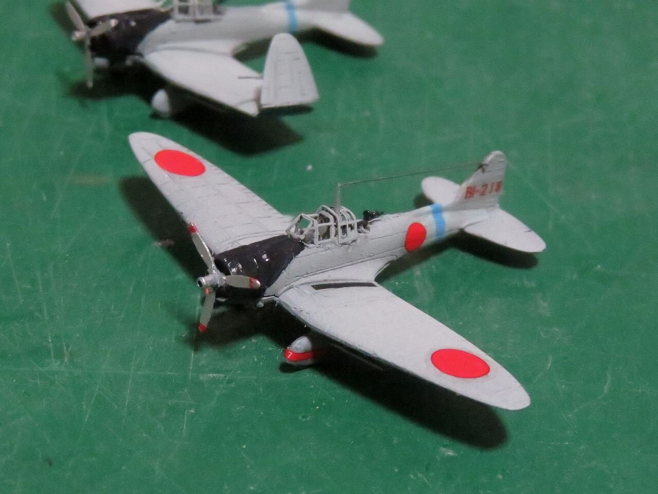艦載機はピットロードの日本海軍艦載機(後期)セットを使いました。各機の主翼前縁に描かれていた黄色い敵味方識別帯は昭和19年秋、第三航空戦隊に対して塗りつぶす(或いは削り取る)指示が下り、消された記録が有りますので模型でもその状態を再現しています。