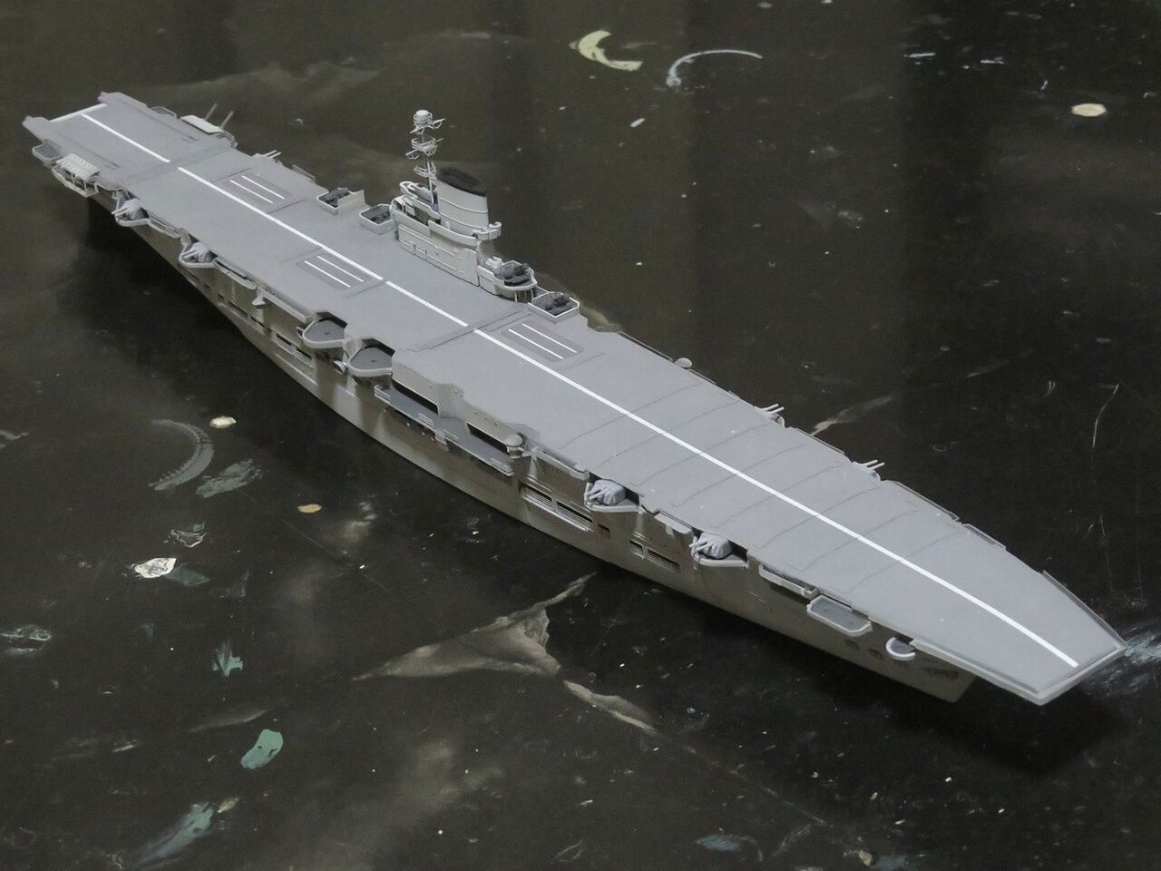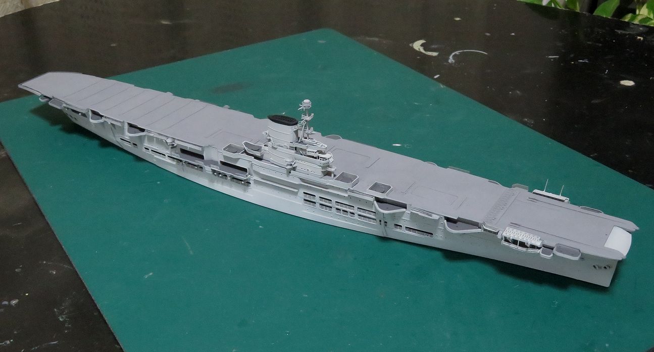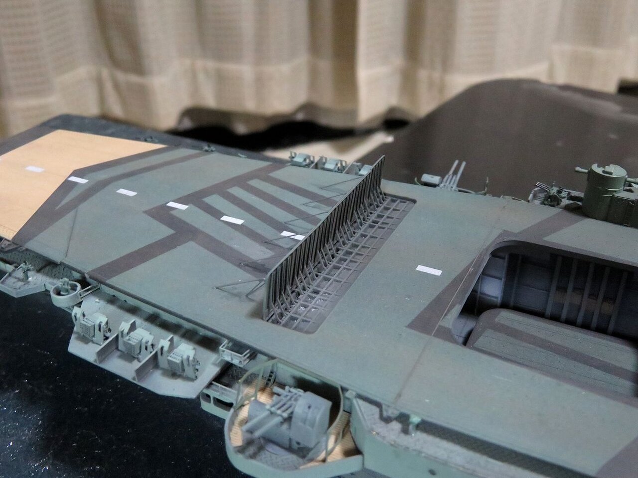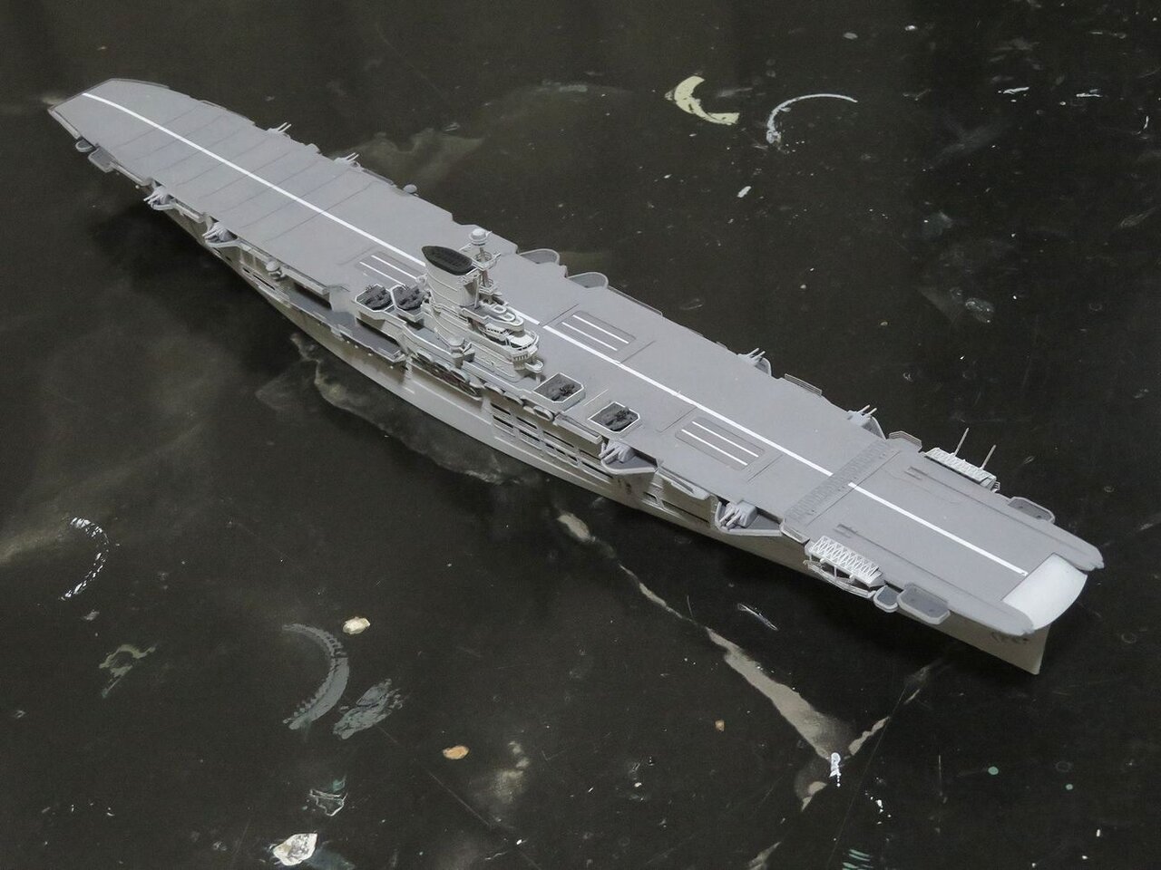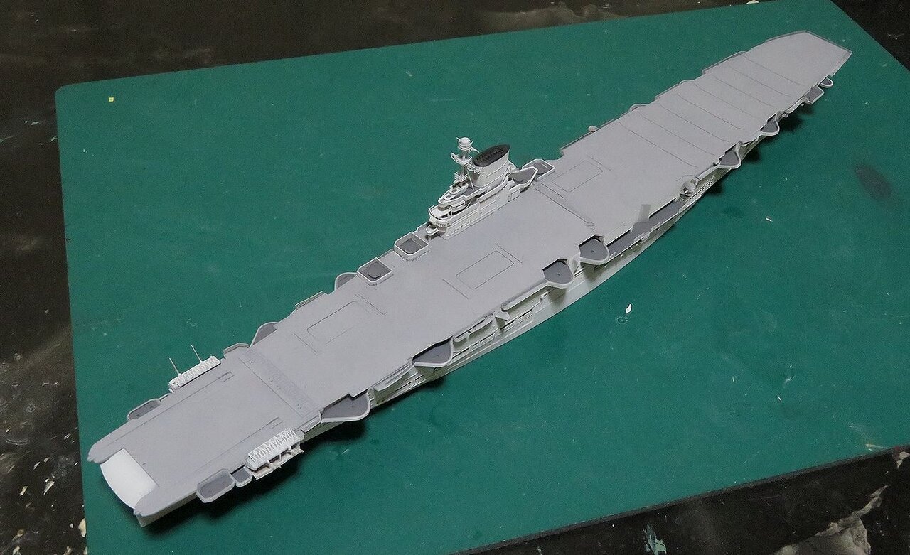日本空母なら木甲板の板目とかマスキングテープを引くのにガイドになるものが有るのですが、このアークロイヤルの飛行甲板はツルツルで全く目印になるようなものは有りません・・・。