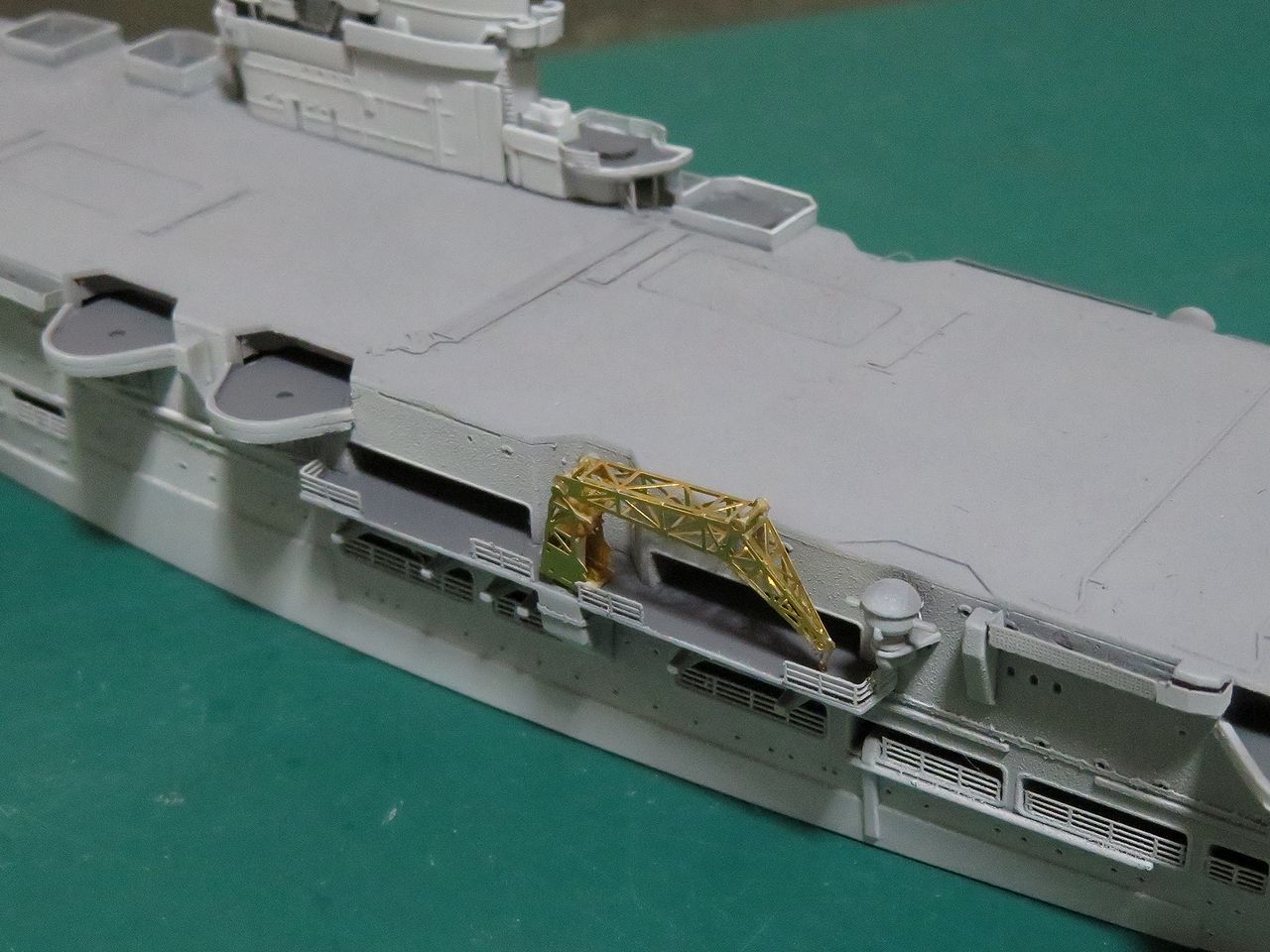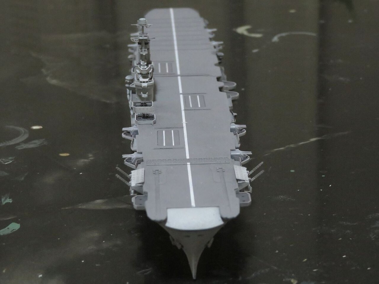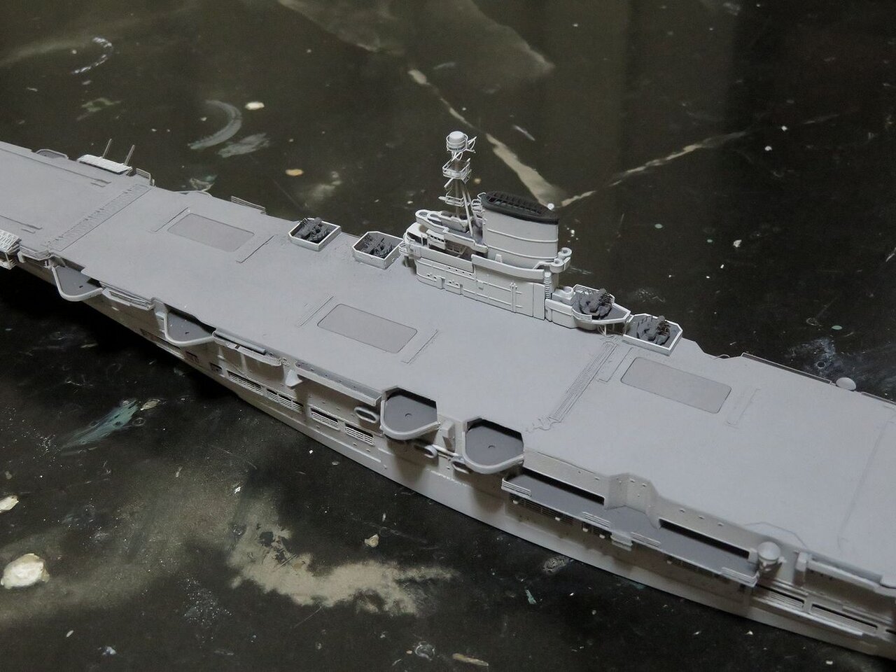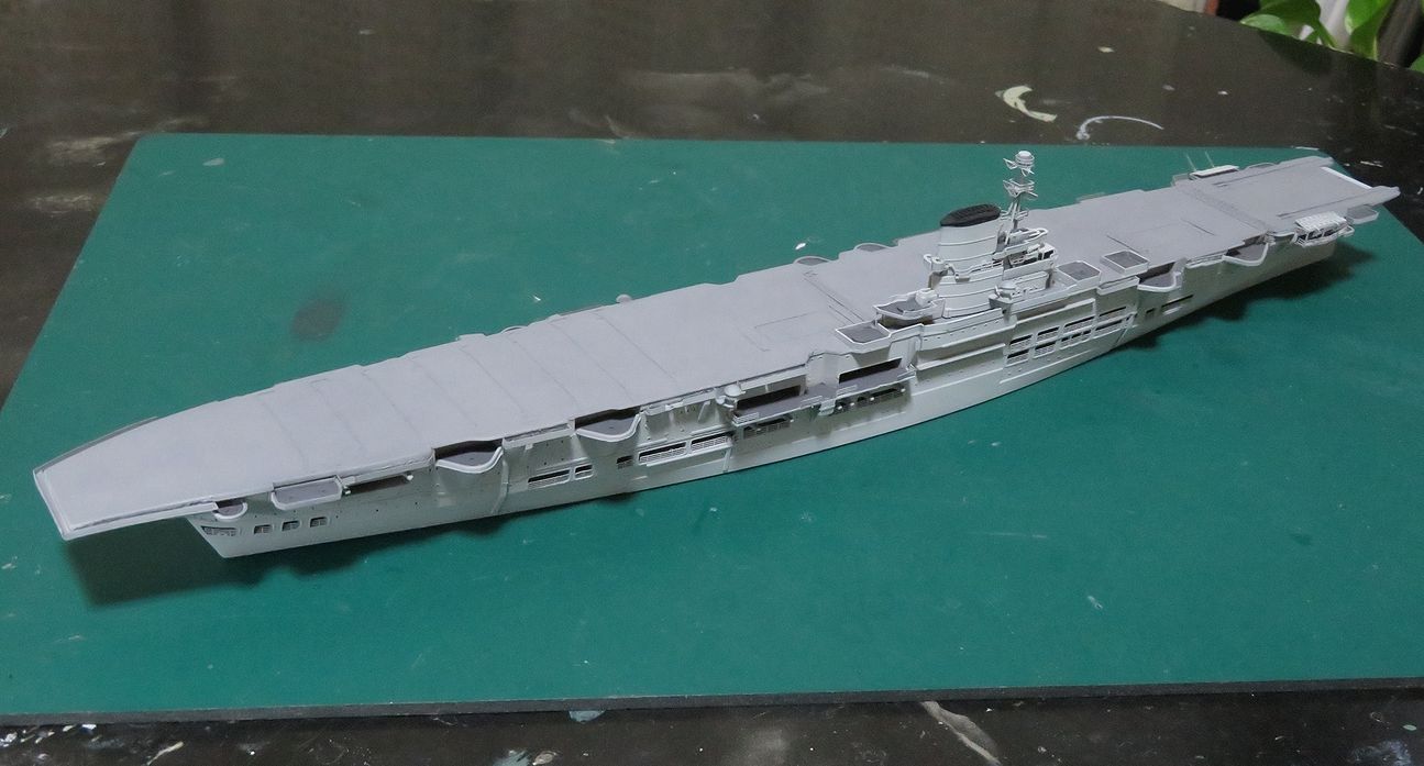 日本空母なら木甲板の板目とかマスキングテープを引くのにガイドになるものが有るのですが、このアークロイヤルの飛行甲板はツルツルで全く目印になるようなものは有りません・・・。