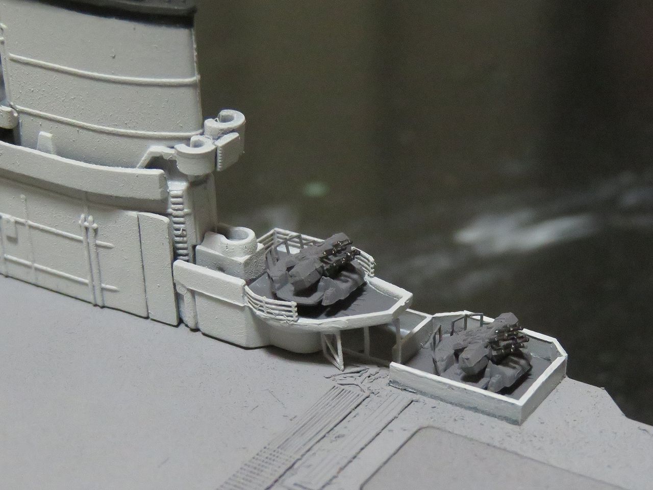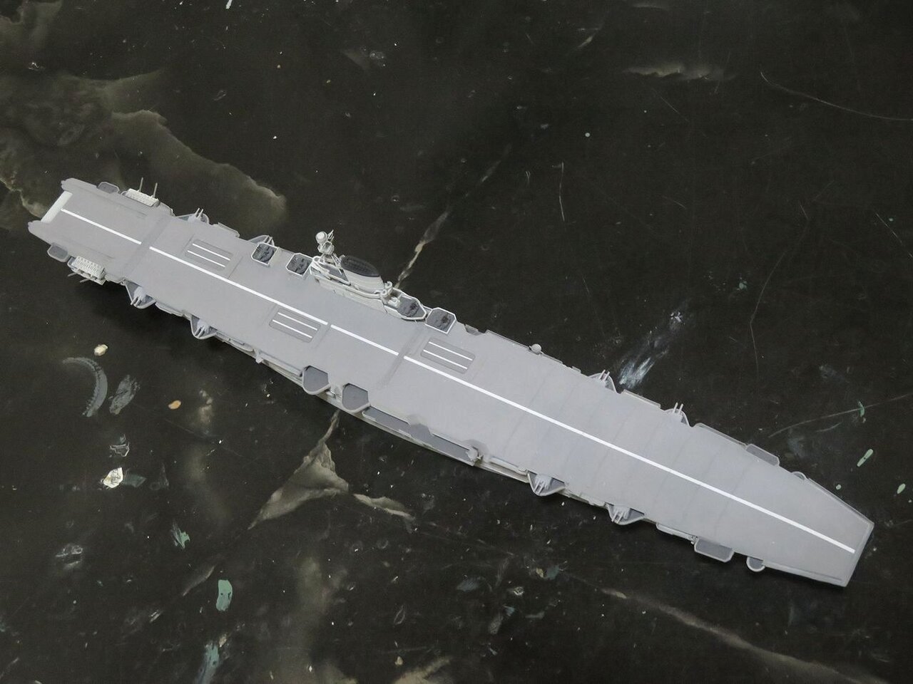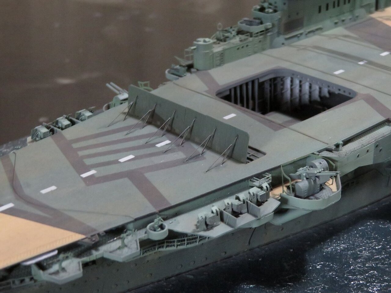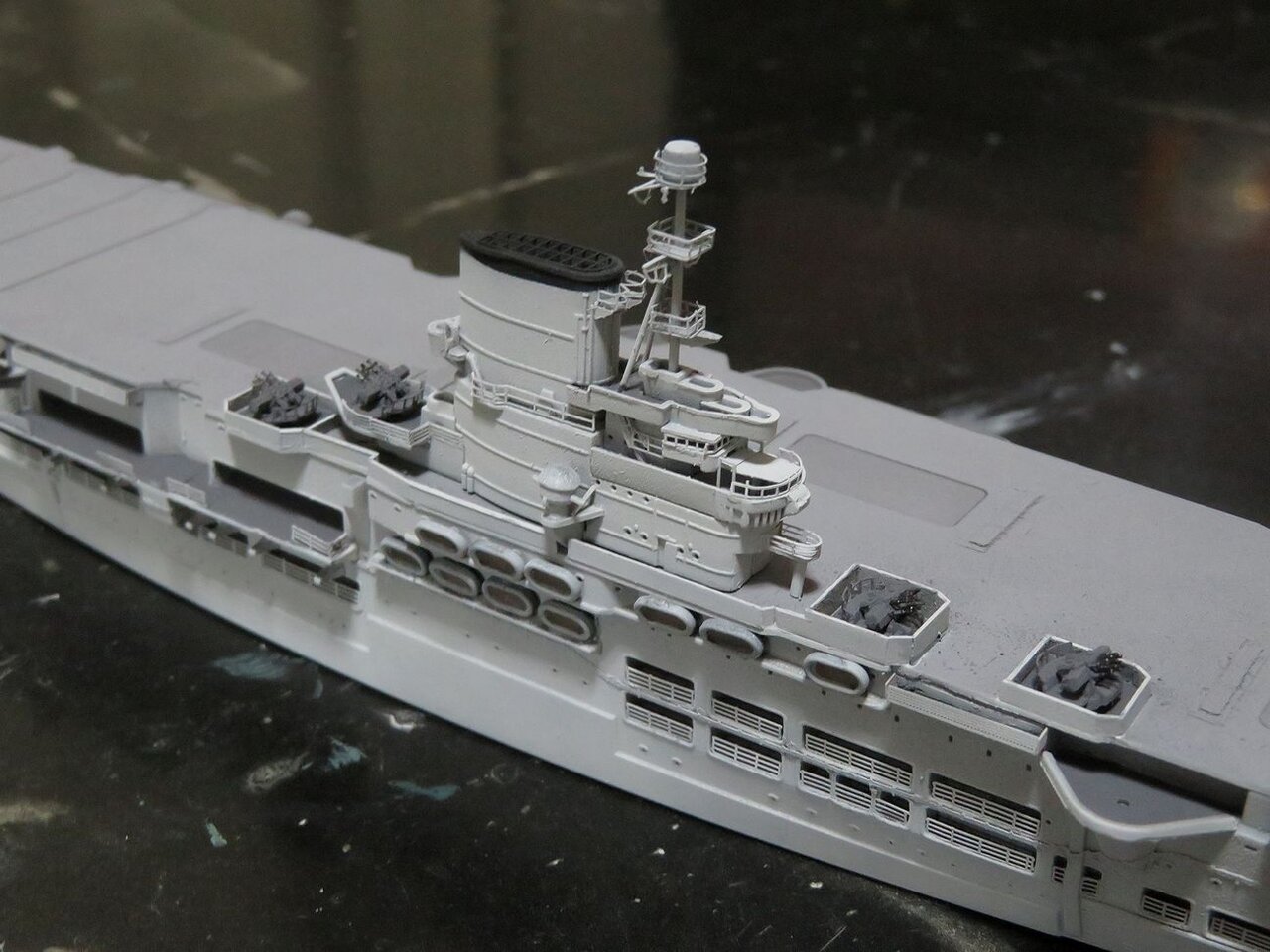 日本空母なら木甲板の板目とかマスキングテープを引くのにガイドになるものが有るのですが、このアークロイヤルの飛行甲板はツルツルで全く目印になるようなものは有りません・・・。