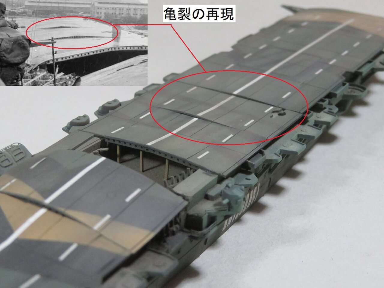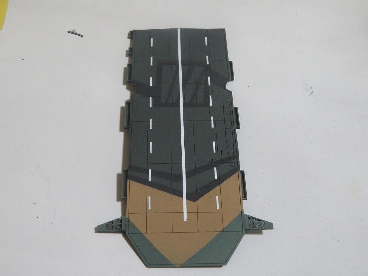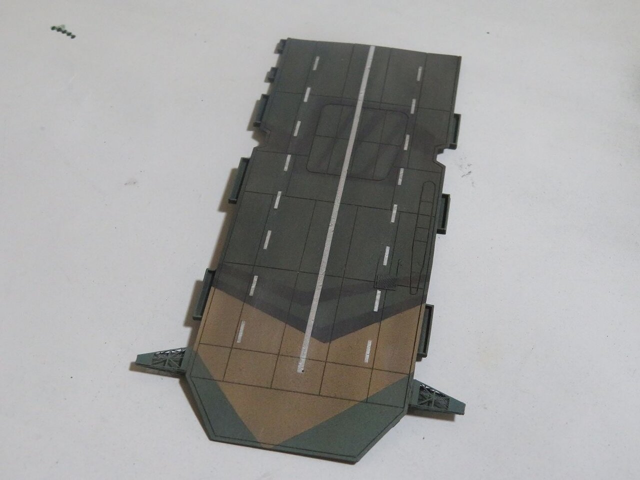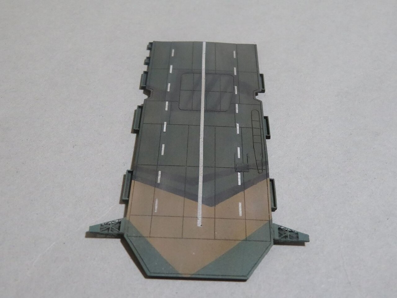 飛行甲板の迷彩塗装を始めました。とりあえず中央の破裂穴までの前半分を塗装しました。