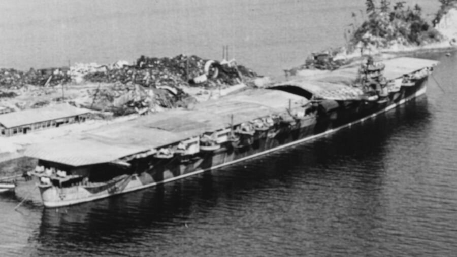 終戦前後の葛城の飛行甲板には迷彩塗装が残されたままでしたが、もちろん「ペンキ塗りたて」状態ではなくかなり退色してカスれた状態だったようです。