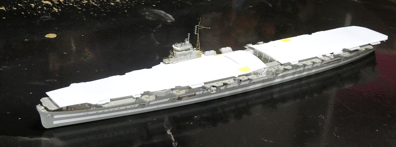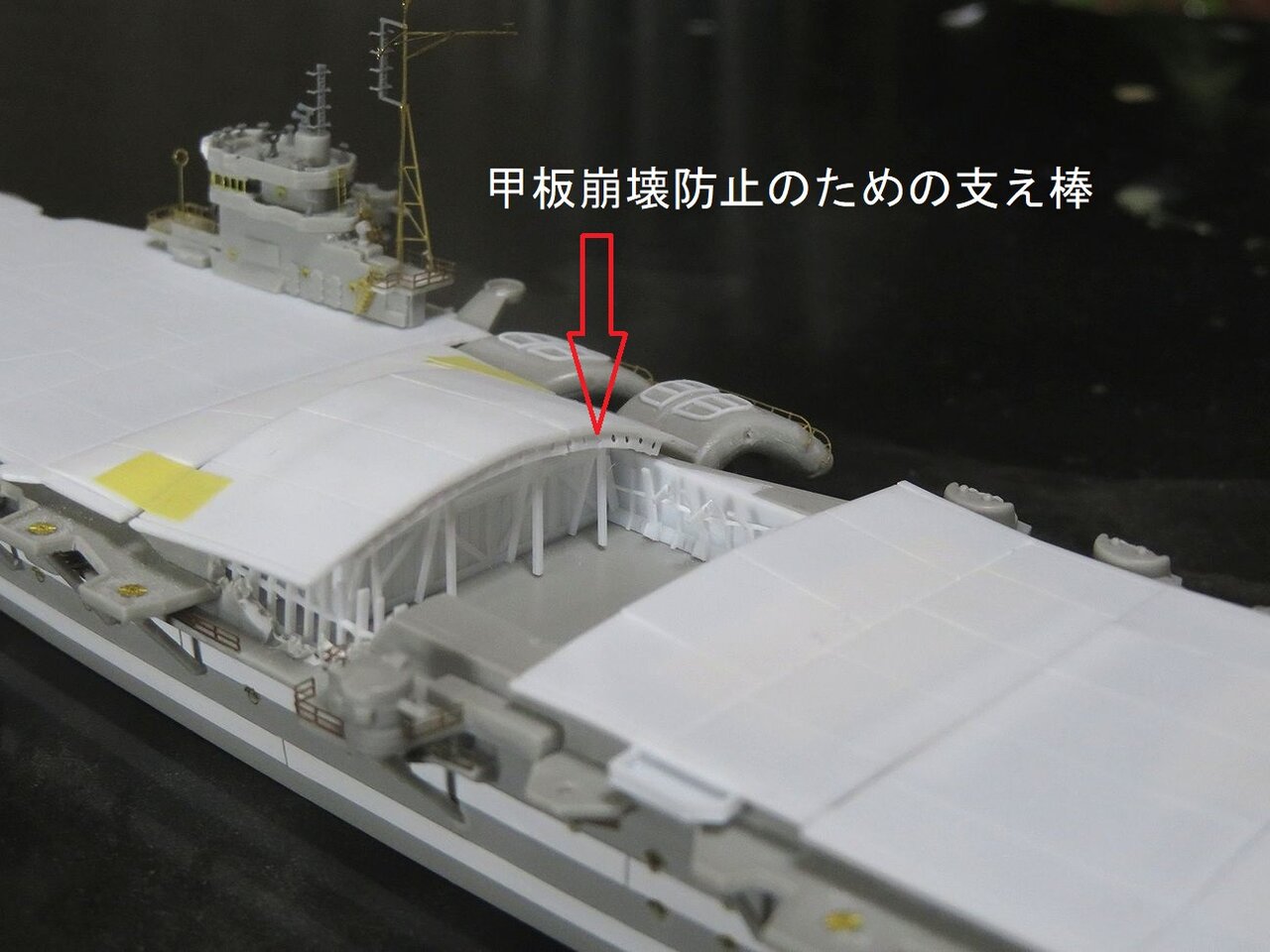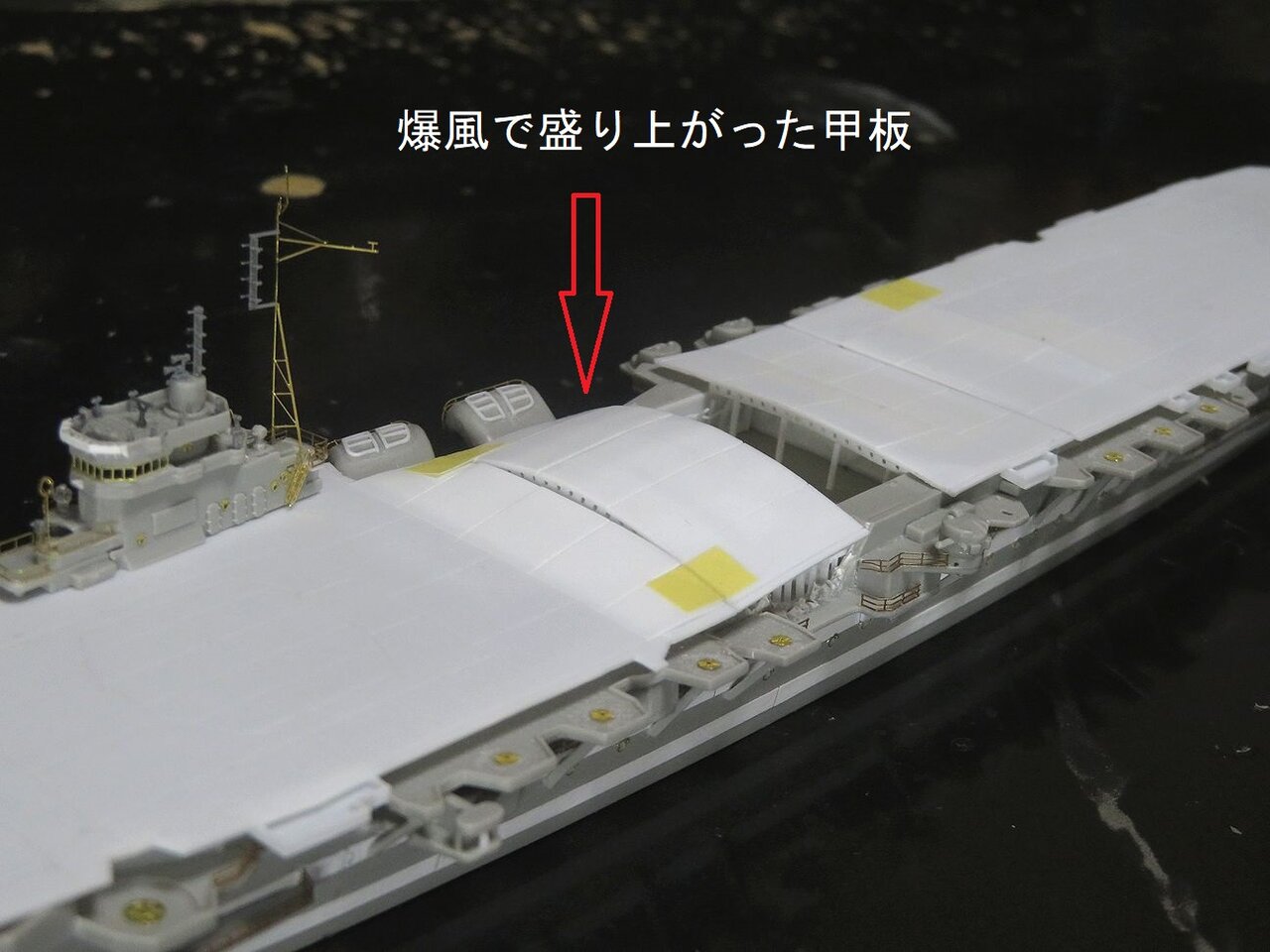 損傷を受けた飛行甲板は修理せずそのまま運用されました。また壊れた飛行甲板が崩壊してこないように何本かの「つっかえ棒」で支えたとの事ですのでその壊れた格納庫とめくれ上がった飛行甲板を再現することがこの模型の最大のポイントとなります。
