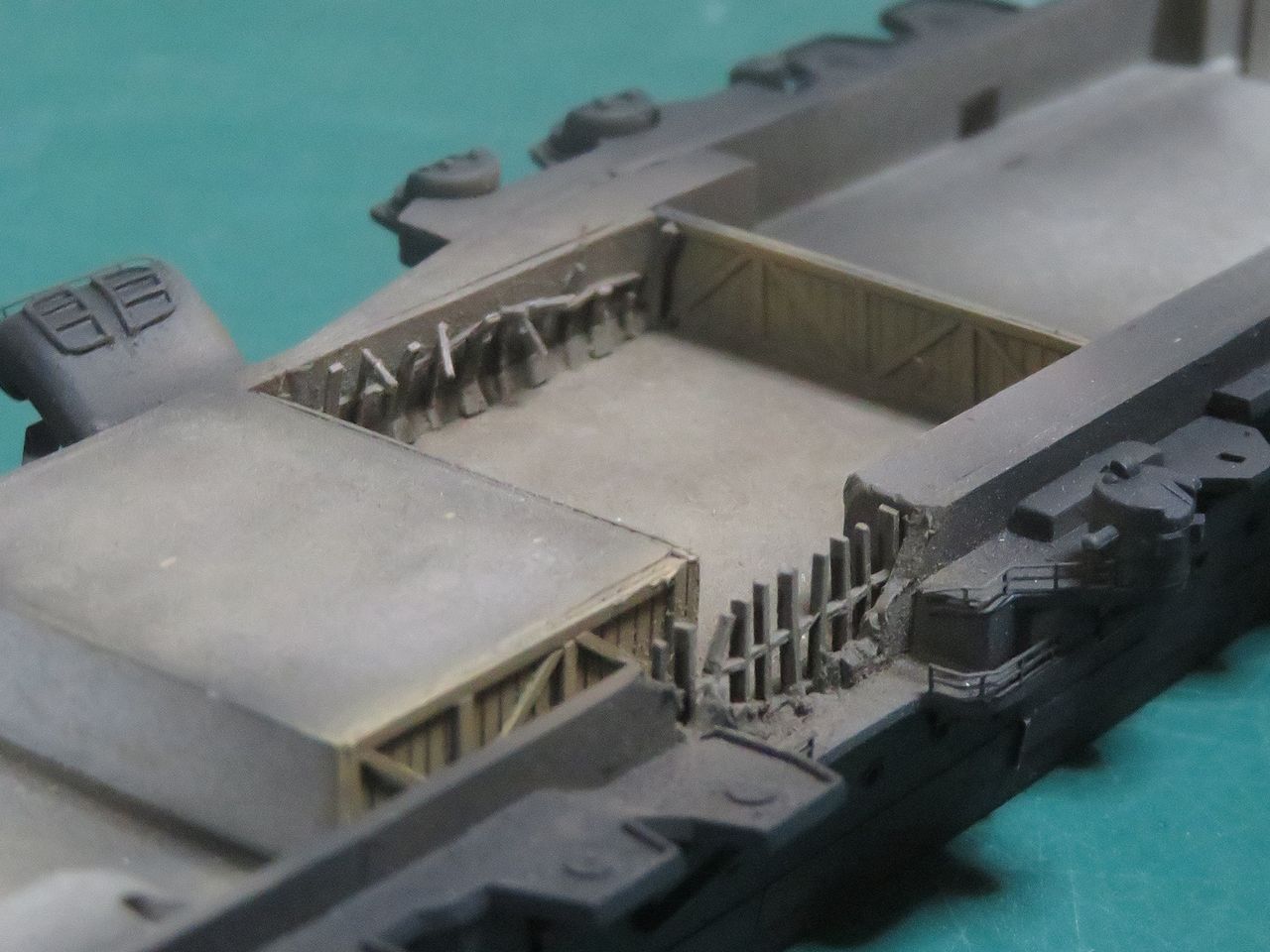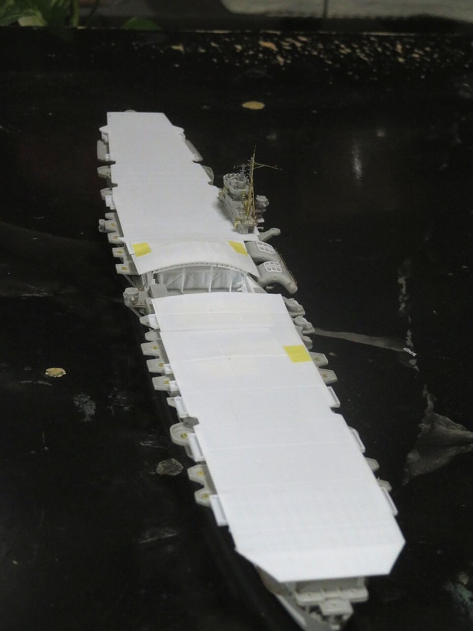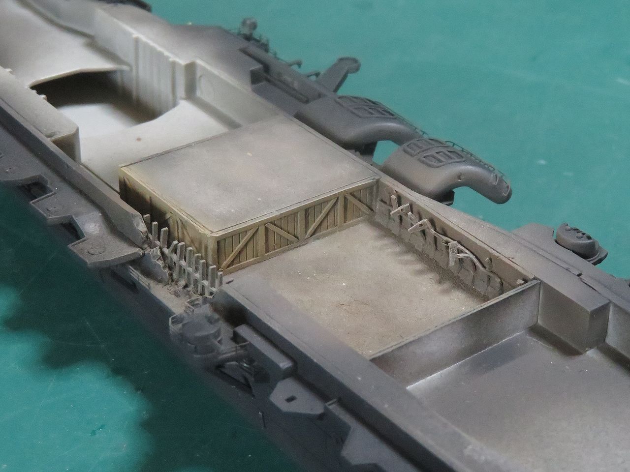 損傷を受けた飛行甲板は修理せずそのまま運用されました。また壊れた飛行甲板が崩壊してこないように何本かの「つっかえ棒」で支えたとの事ですのでその壊れた格納庫とめくれ上がった飛行甲板を再現することがこの模型の最大のポイントとなります。