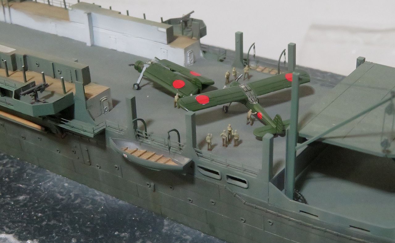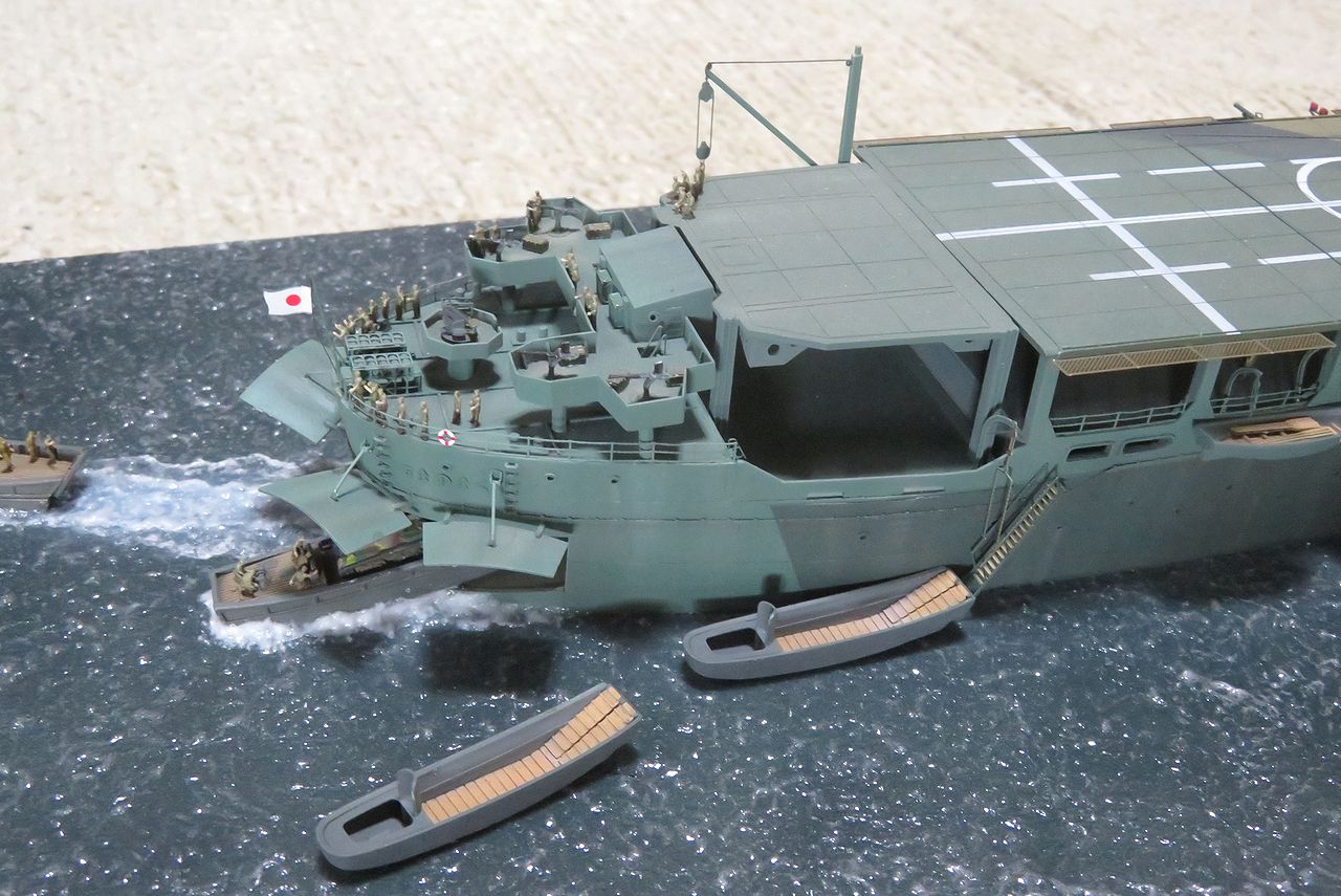 今回の熊野丸では船体構造がシンプルであまり見せ場が有りませんので艦尾からの舟艇出動を大きな見せ場として用意しました、