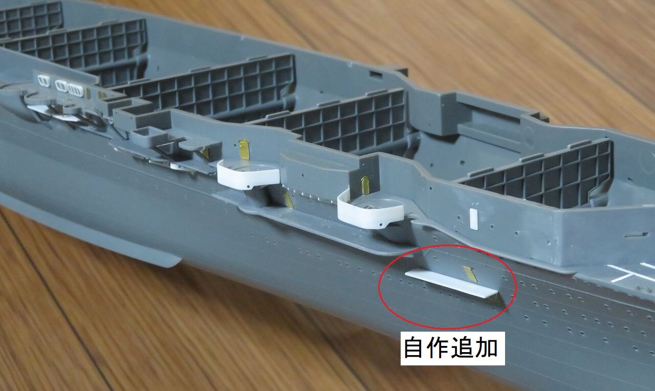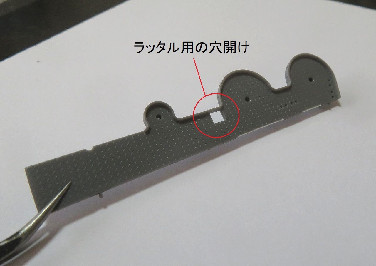 この赤丸部分はキットではスルーされていますのでプラ板で追加します。