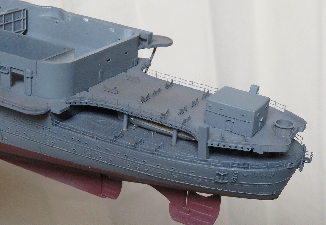 なお、お気づきの方もいらっしゃるかもしれませんが、キットの艦尾甲板の「張り出し部分(赤線部分)」は今作では削り落としています。