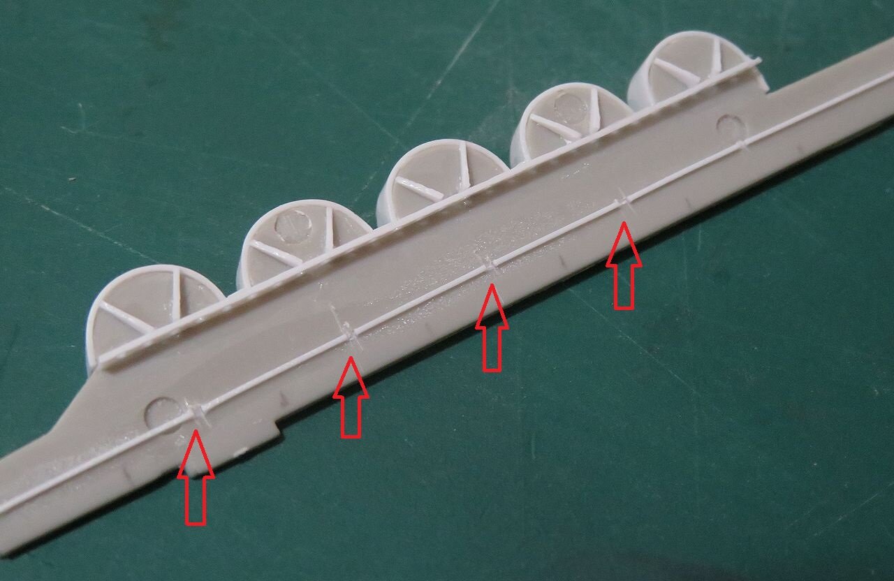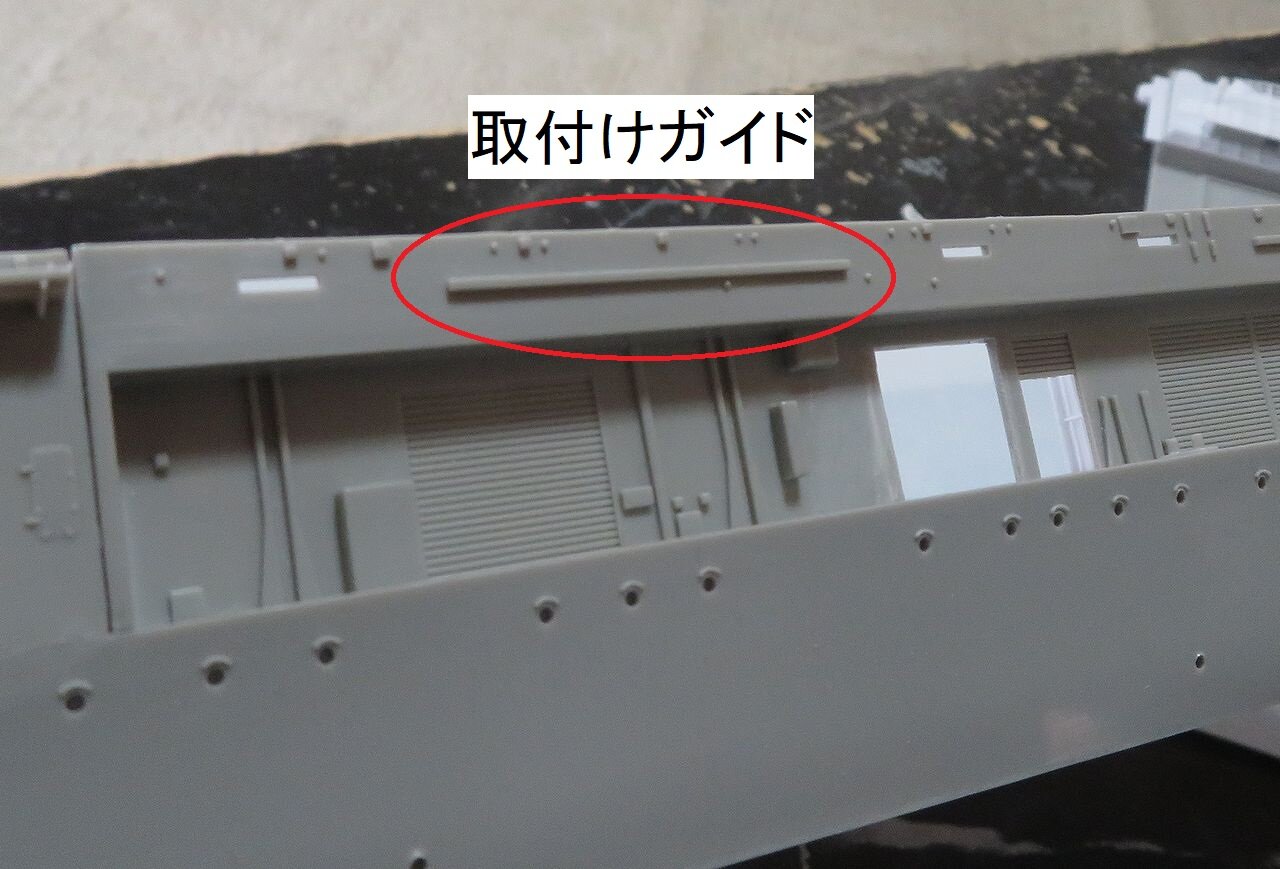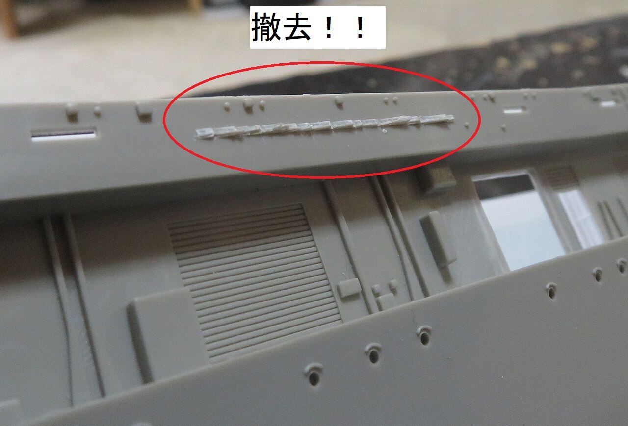 これを船体に取り付けるのですが、キット側の「取付けガイド」のこの部分が干渉して邪魔になります。
