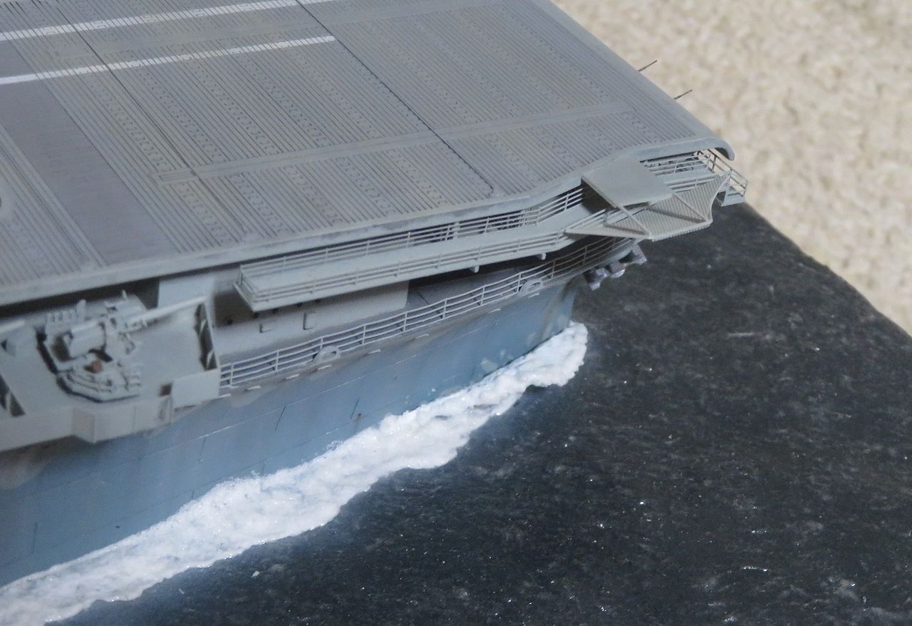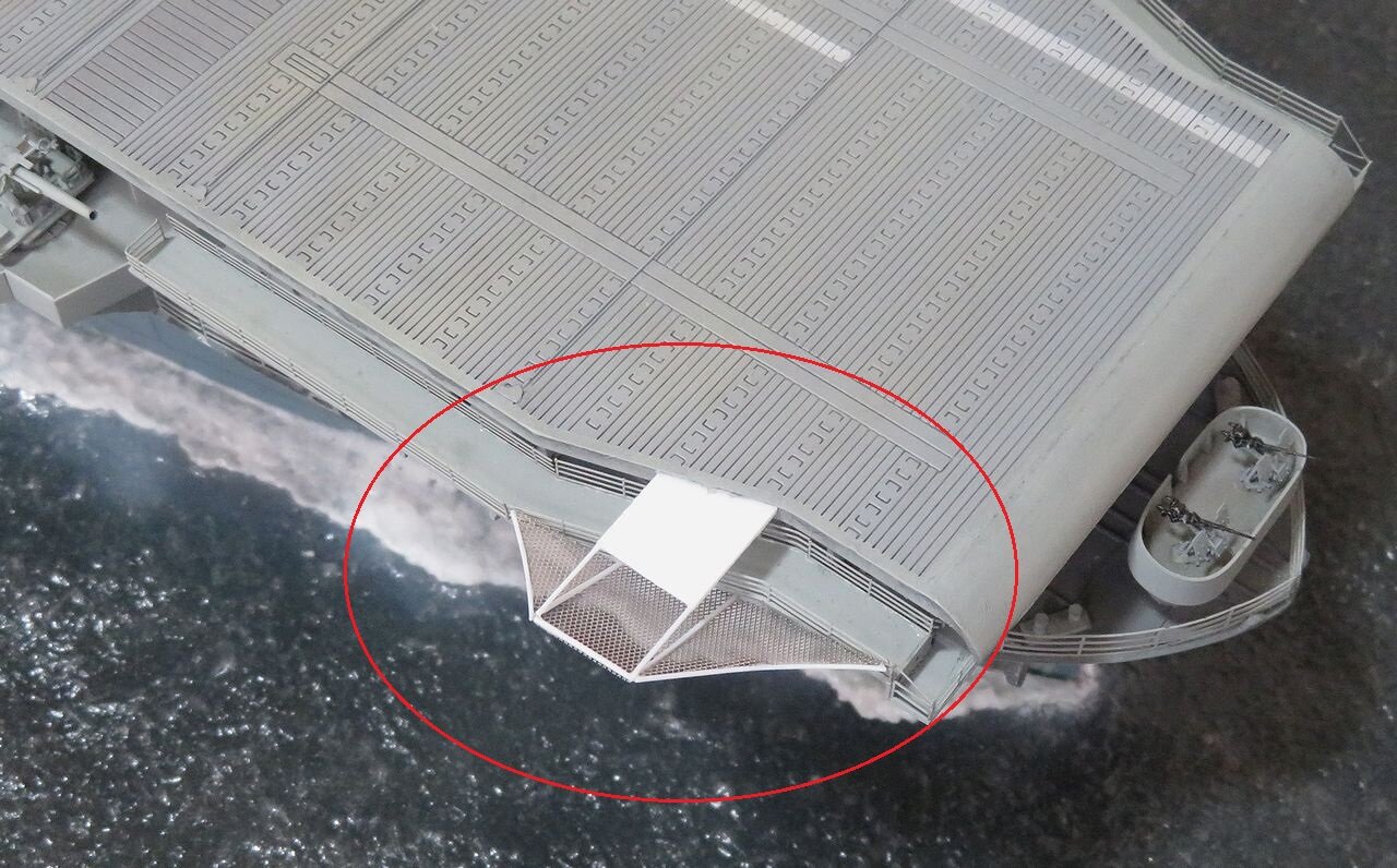 飛行甲板前端には兵員の退避スペースが有りますがキットでは省略されていますね。
