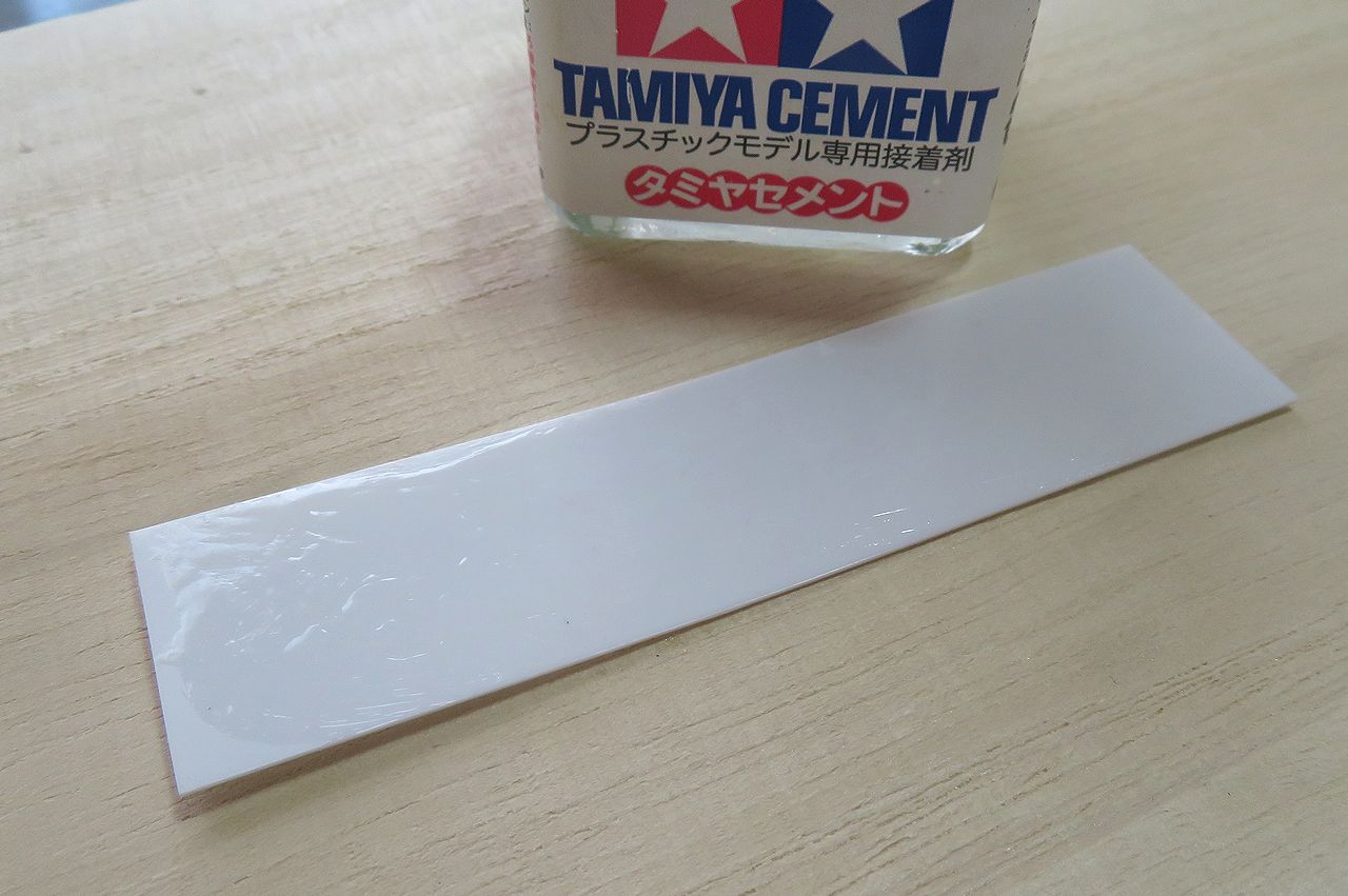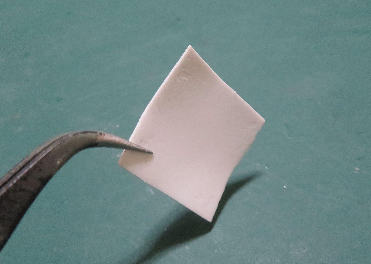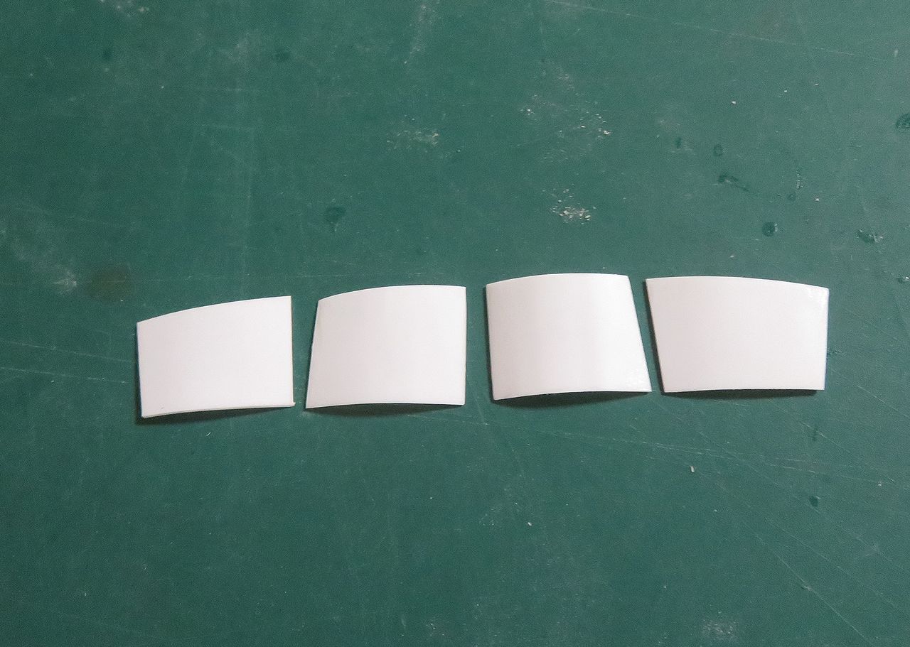 しばらく放置するとプラが溶け始めて柔らかくなってきますので指で圧を掛けながら湾曲させていきます。そして必要枚数(4枚)にカットします。