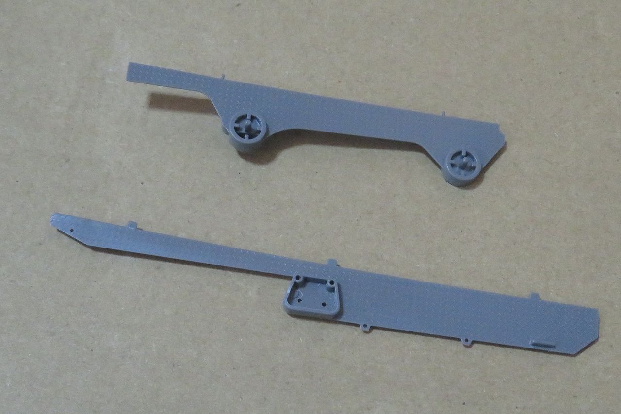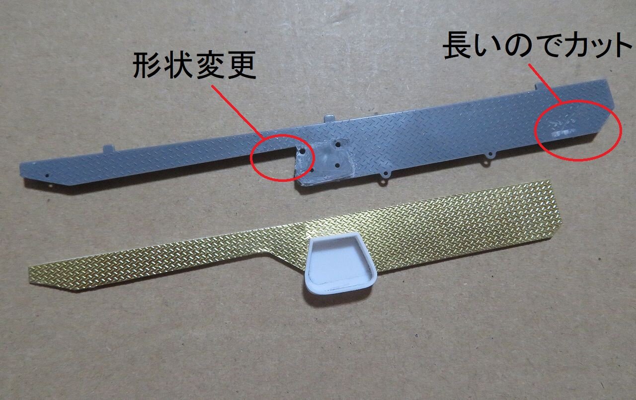 初めに下側のパーツです。赤丸の部分が気になりますのでプラ板から作り直しました。さらに滑り止めのエッチングシートを貼り付けています。