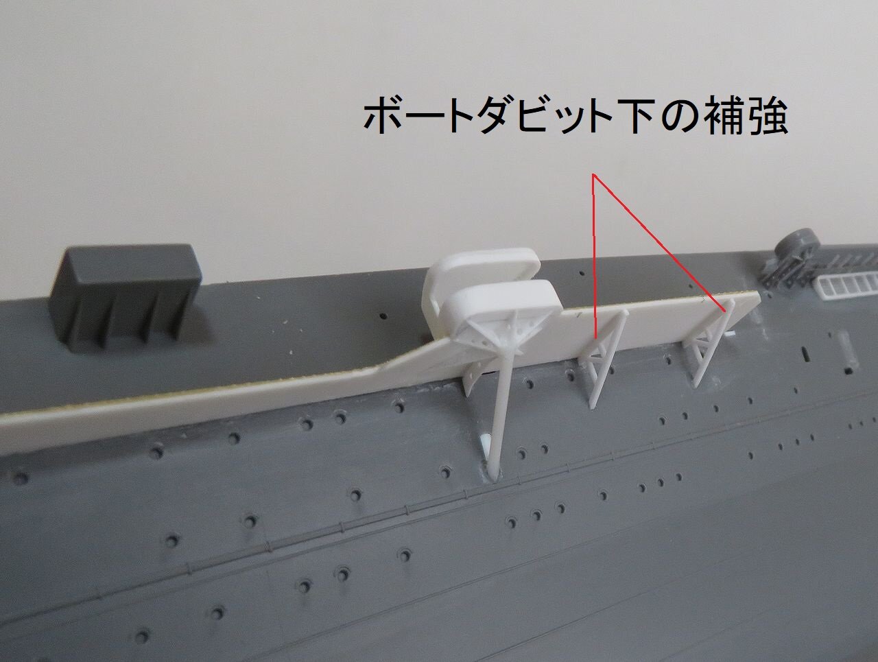 ボートダビットの直下には大きな負荷が掛かりますのでこのような頑丈な補強になっています。細く切り出したプラ材を組んで取り付けます。