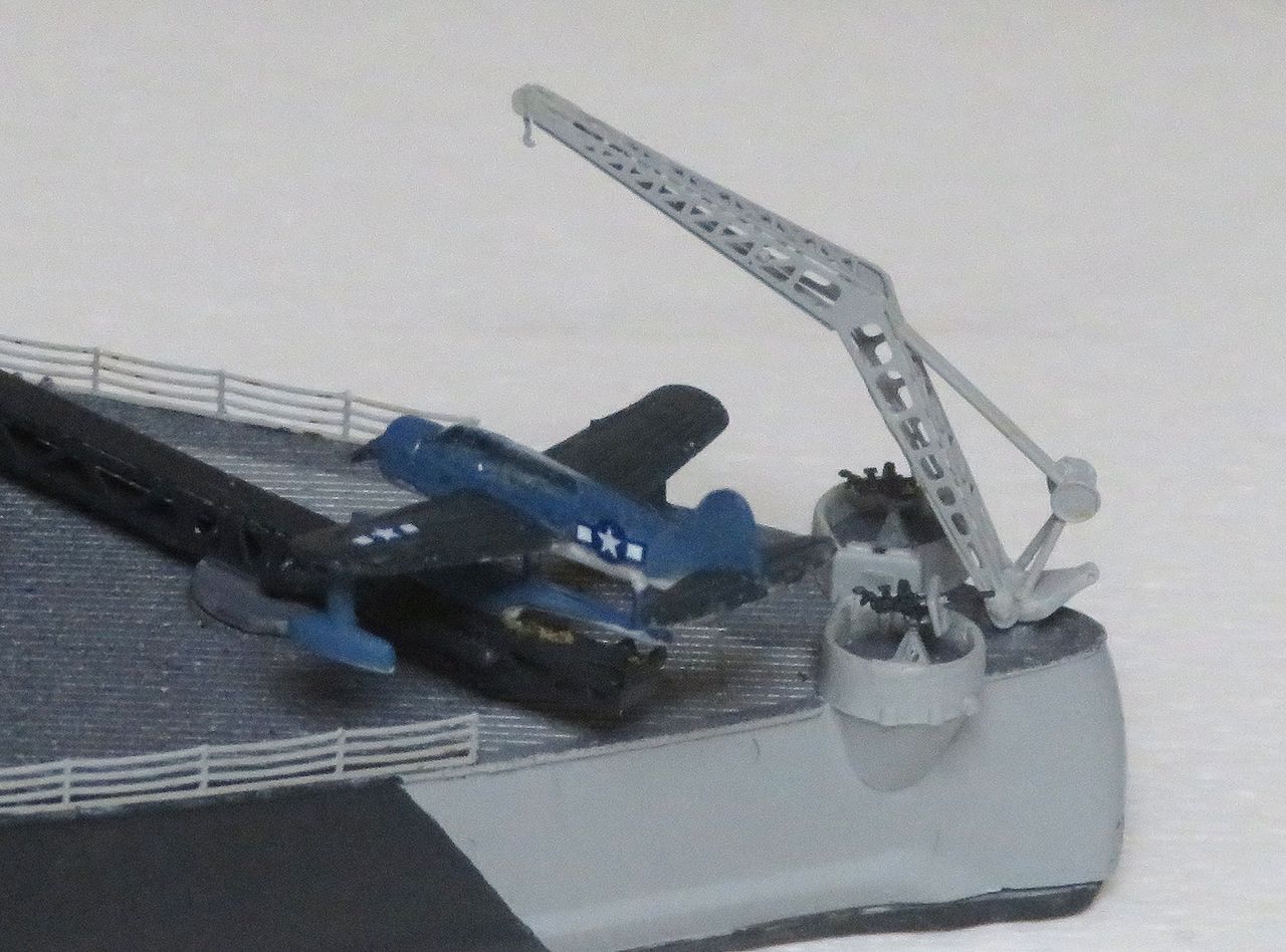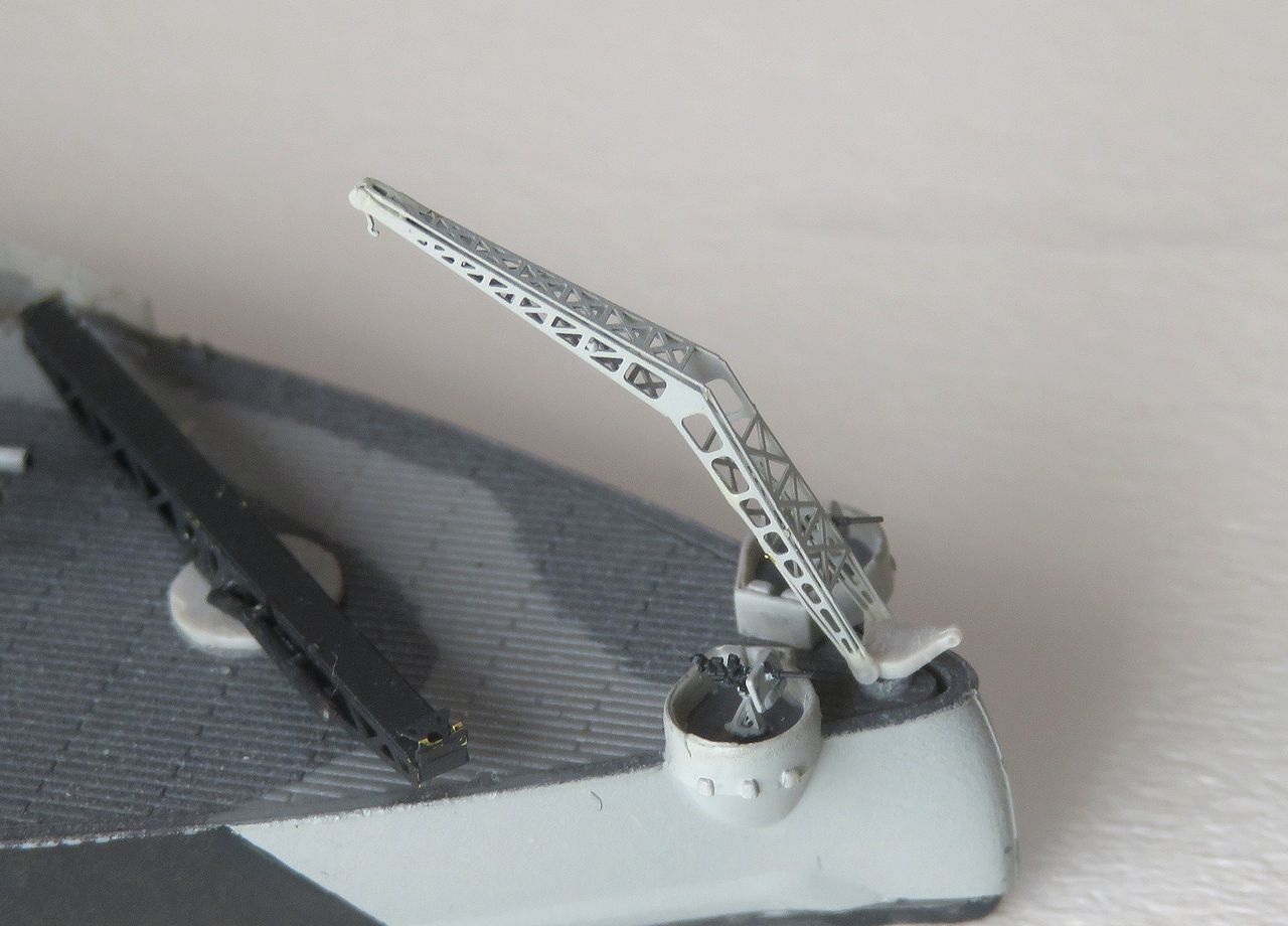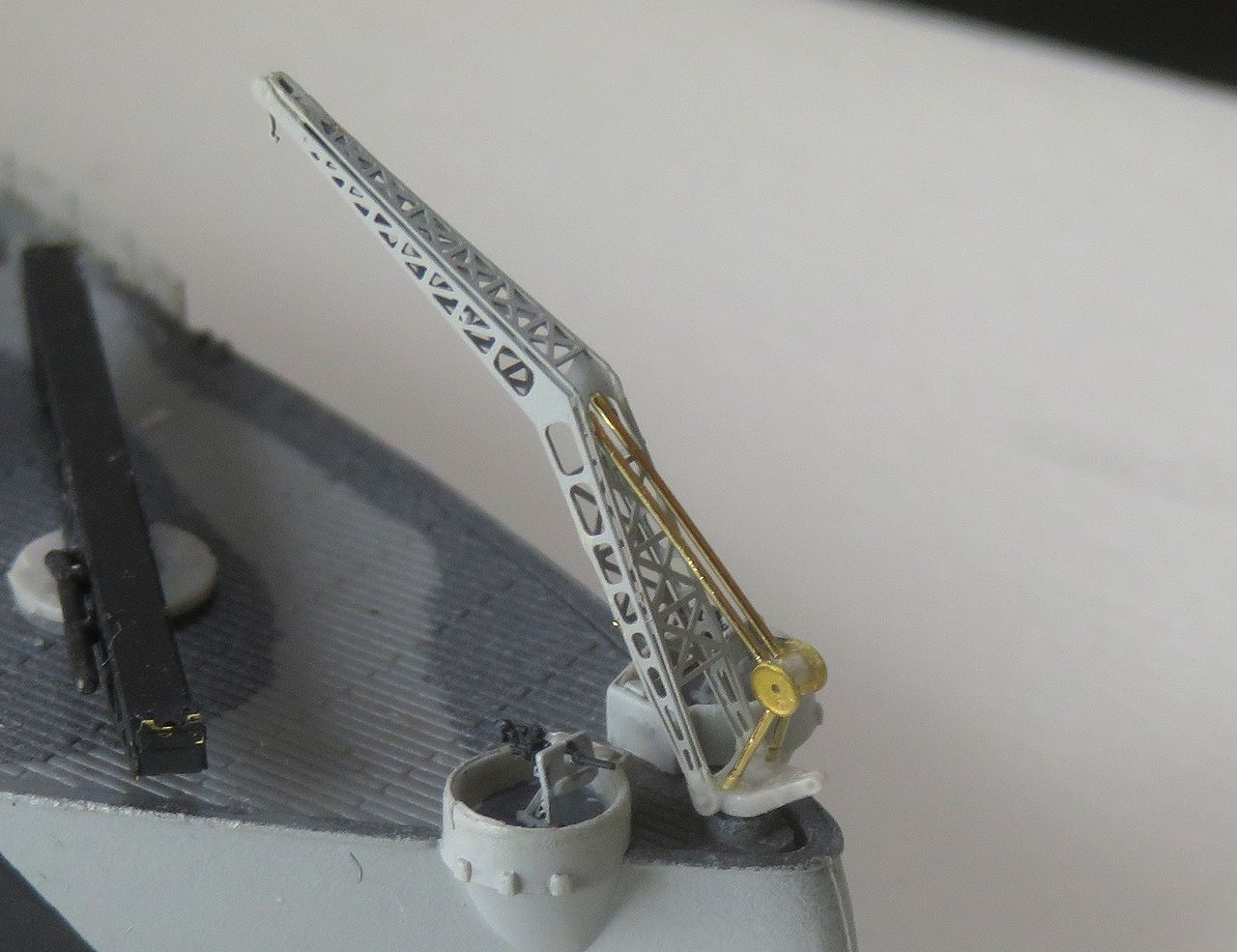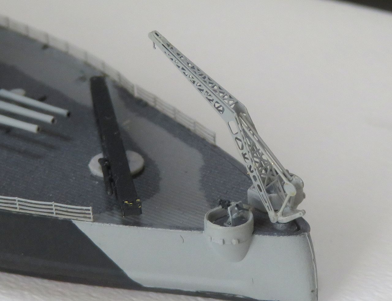 このキット、艦尾のクレーンはプラで一体成型されています、このように。