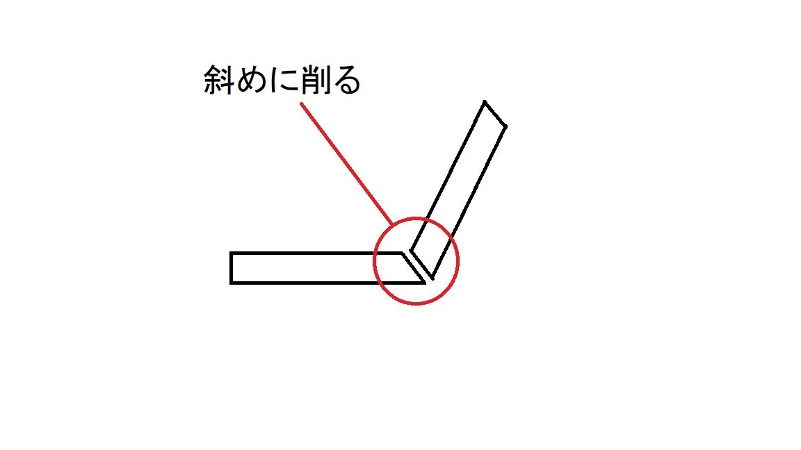そこで次の図のように接合する両面をナイフのカンナ掛けで斜めに加工しておきます。