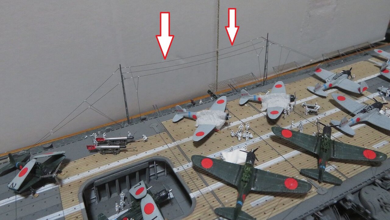 張り線用に使っているメタルリギングが無くなってしまったので発注したのですが、過去作でボツになった何本かの線が有りましたのでそれを使って右舷側の張り線を仕上げました。