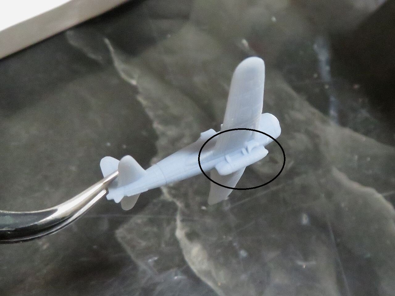 そうと決まれば加工です。余計なバリのようなものを除去して機体をチェックしますが、この増槽タンク部分の造形が気になりますので・・・。
