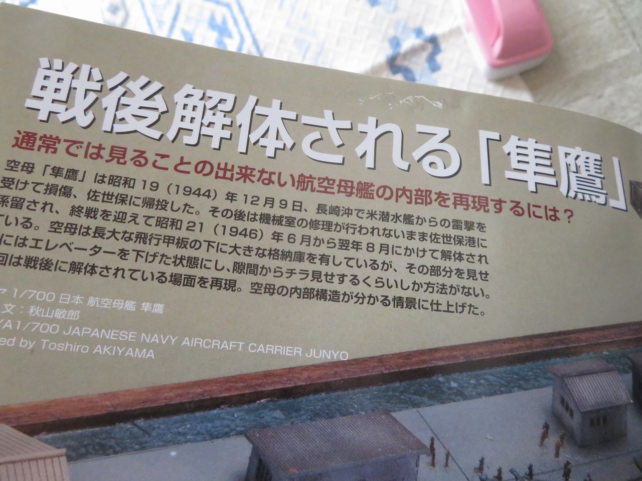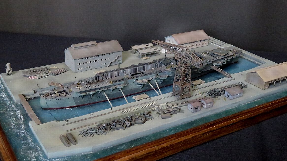 ある日別の探し物をしている時、久しぶりにそのキットを見つけて懐かしくなり「これを使って何かジオラマが作れないかな?」と思いを巡らせて考え付いたのが「戦後に解体される隼鷹の姿」でした。